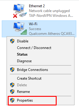 3. Right-click the TAP-NordVPN Windows adapter V9 and choose Properties.