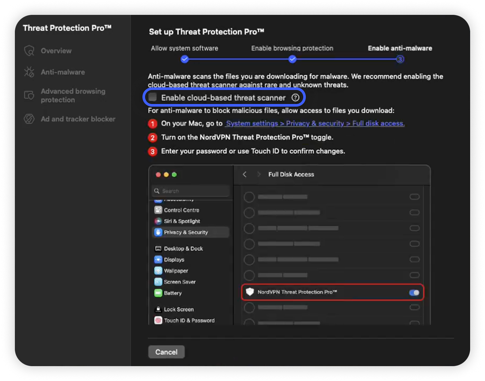 Läs guiden nedan för att aktivera och börja använda Threat Protection Pro™ i de senaste macOS-versionerna. Om du använder en äldre macOS-version kan du läsa om att aktivera Threat Protection Pro™ på äldre macOS-versioner.