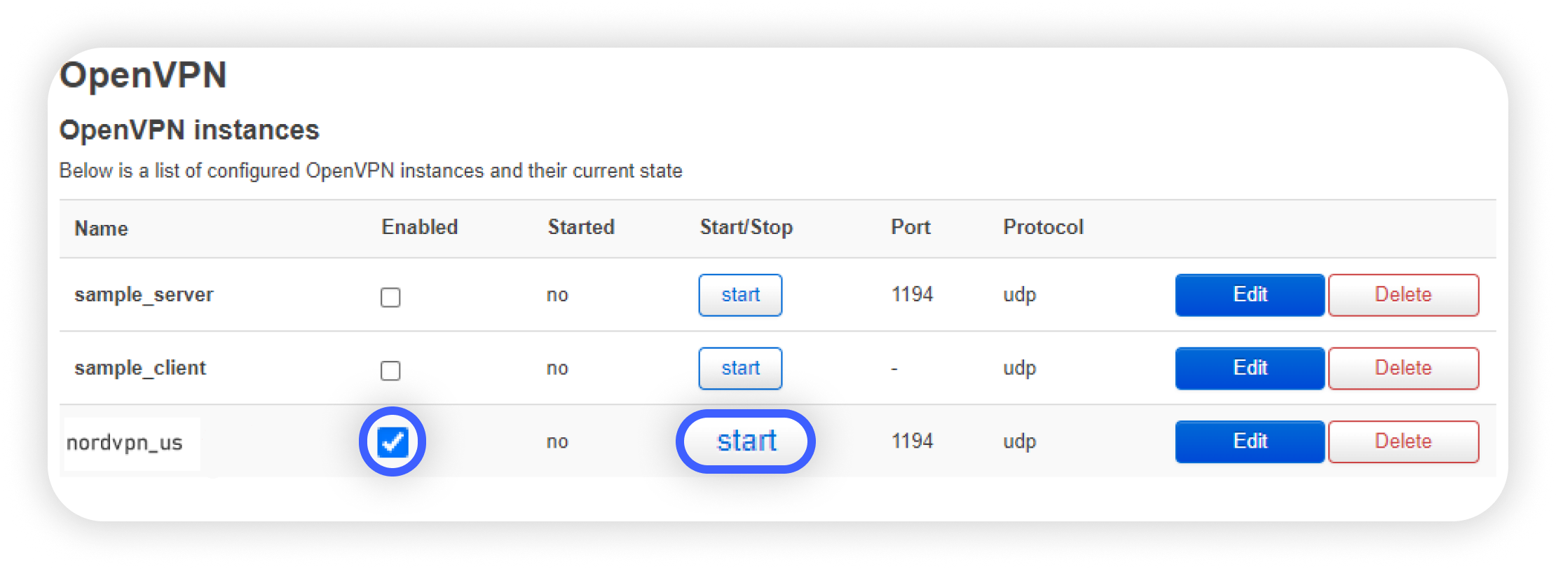 Efter det bör filen "/etc/config/openvpn" ha följande strängar tillagda:uci set openvpn.nordvpn=openvpn uci set openvpn.nordvpn.enabled='1' uci set openvpn.nordvpn.config='/etc/openvpn/uk2054.nordvpn.com.udp.ovpn' uci commit openvpn