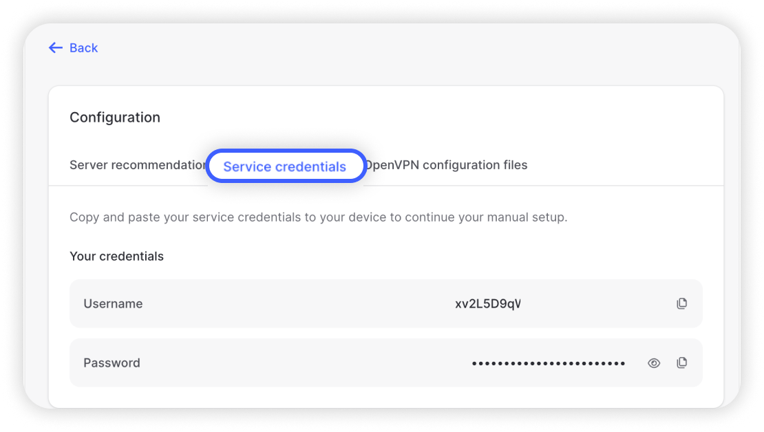 För att hitta dina NordVPN-tjänsteuppgifter loggar du in på ditt Nord Account, klickar på NordVPN, sedan Manuell konfiguration och sedan Tjänsteuppgifter. Du hittar ditt användarnamn och lösenord som behövs för att ansluta manuellt.