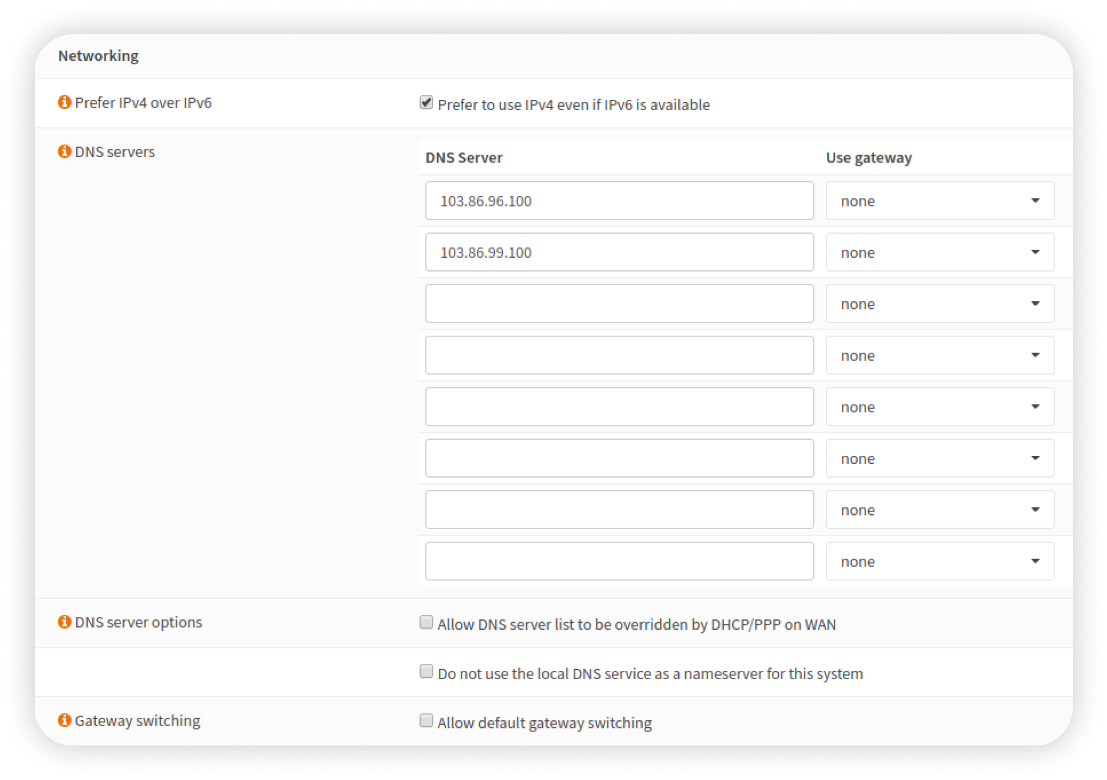 103.86.99.100, Use Gateway: none. För DNS server options, avmarkerar du Allow DNS server list to be overridden by DHCP/PPP on WAN. Klicka på Save och Apply Changes.