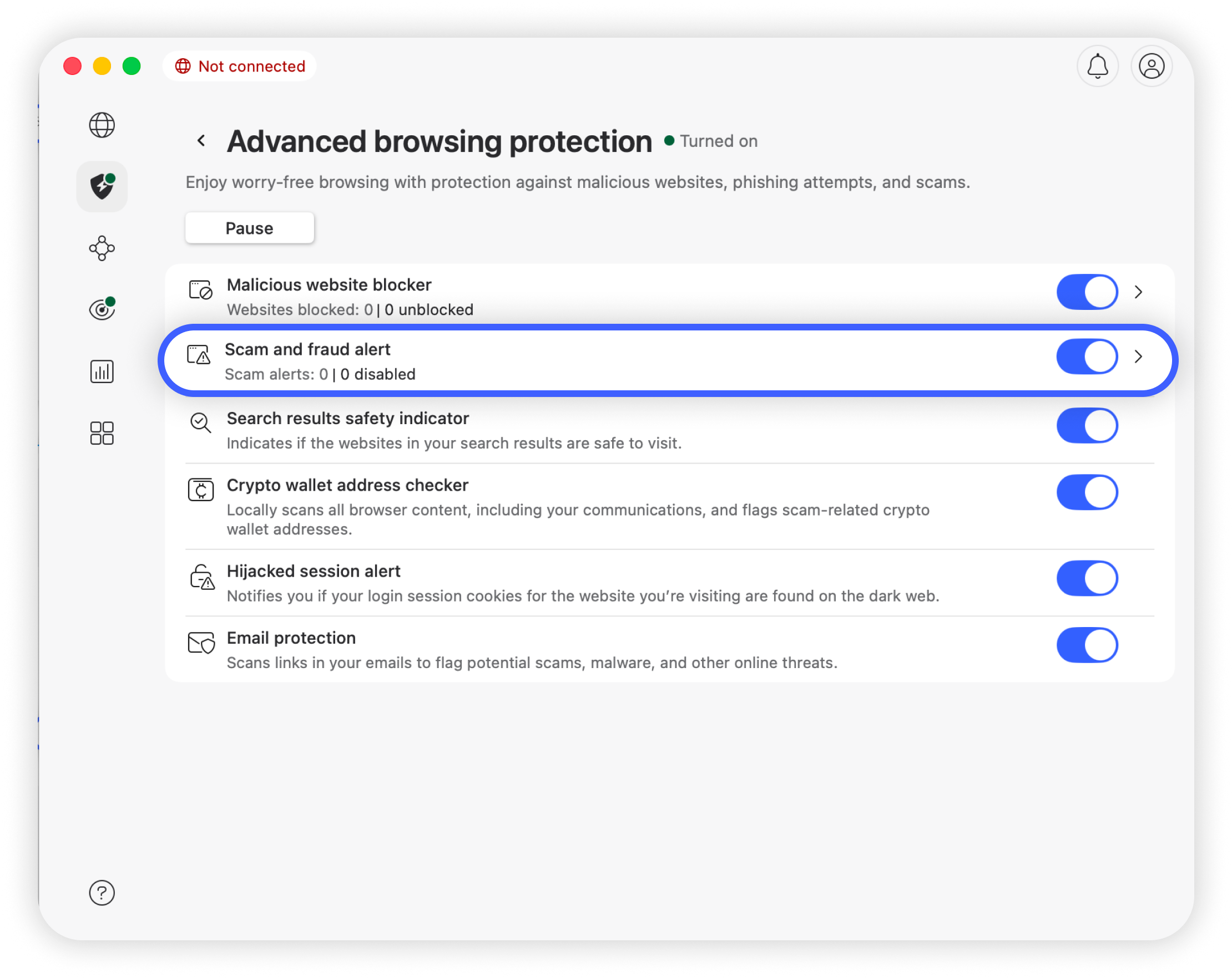 - Skydd mot nätfiske och bedrägerier: Blockerar automatiskt åtkomst till webbplatser för nätfiske och bedrägerier utformade för att stjäla personlig information eller pengar.
