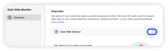 - 點選「產品(四個立方體)」圖示,即可啟用 暗網監測工具;若您的個人憑證在網路上遭到曝光,該工具會向您發出警示。您也可以使用網狀網路,或查看 Nord Security 其他產品。