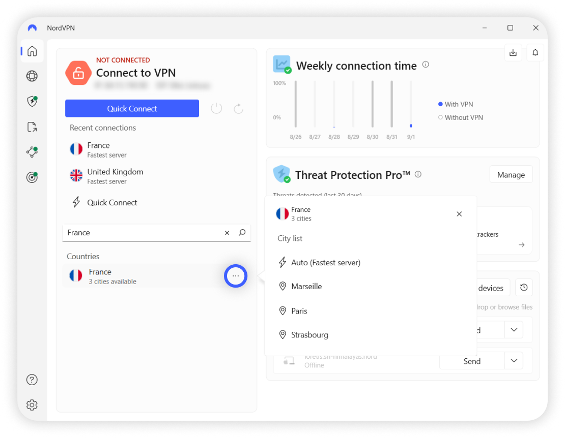 按下首頁圖示後,NordVPN 應用程式會顯示預設的主畫面,您可以輕鬆連線至任何想要的伺服器、查看網狀網路的檔案傳輸、開啟或關閉威脅防護 Pro™ 功能,並查看每週的連線時間。
