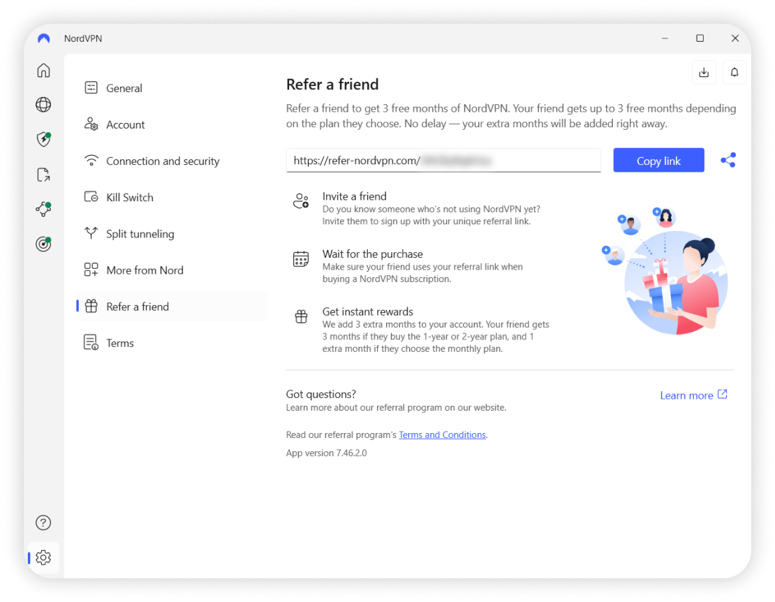 該分頁提供您個人的推薦連結,可以分享給親朋好友並賺取獎勵。 歡迎造訪我們的網站,了解如何透過推薦好友賺取 NordVPN 訂閱權益的詳細資訊。