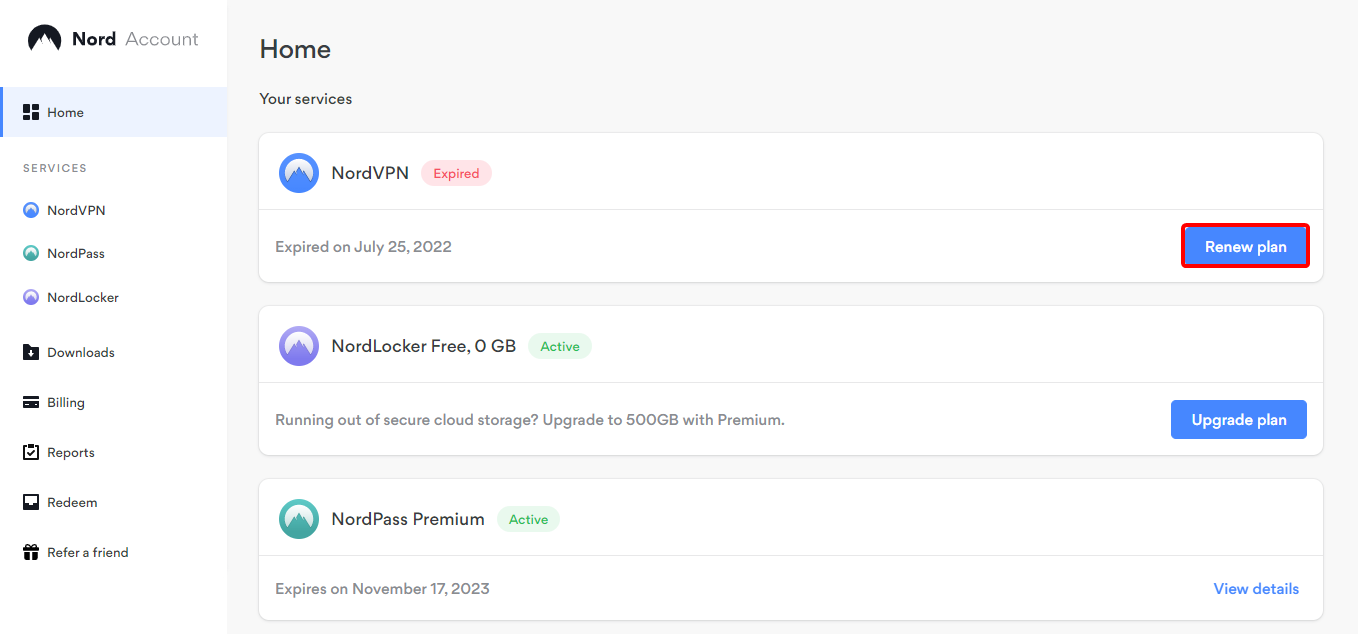 在 Nord 帳戶主頁面,點選「續訂方案 (Renew Plan)」。